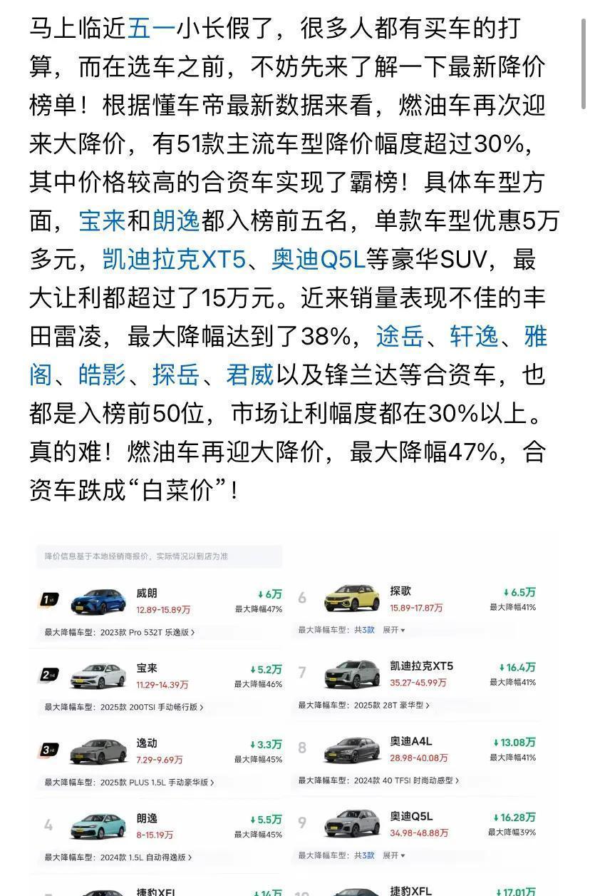 51款主流车型,降价幅度超过30%,合资车几乎霸榜!