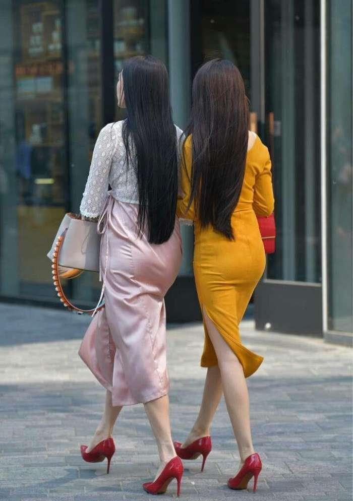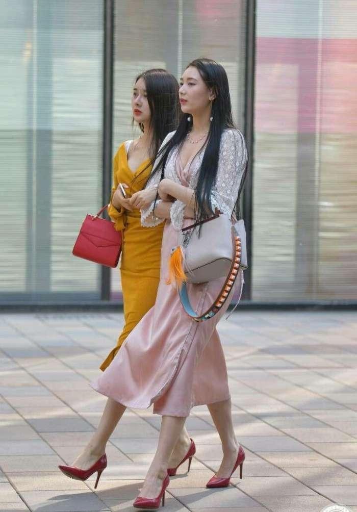 同样是背影杀手的两个及腰长发姑娘,随便走起来都风姿绰约。都是女神风格的两个人从包包上也能看出来更加偏向的风格,大气中带着可爱的淑女风格和很简练的红色小包包,穿搭上一个更活泼一个更内敛。