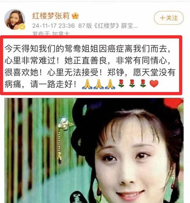 其实,关于郑铮去世的消息,同样是《红楼梦》演员的张莉,在17号和18号就发过两条关于郑铮的动态。