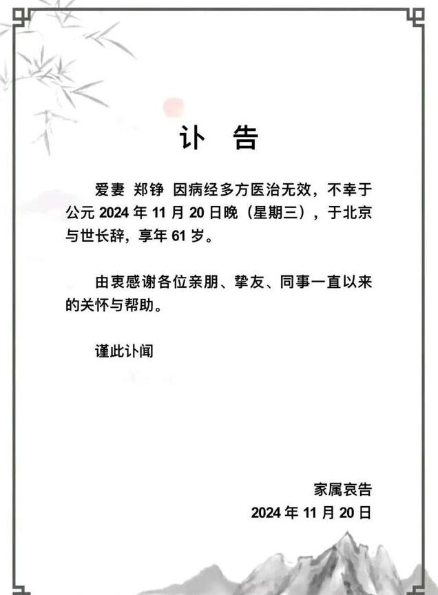 郑铮的丈夫也发了讣告,称爱妻是因病经多方医治无效,在11月20日晚与世长辞。