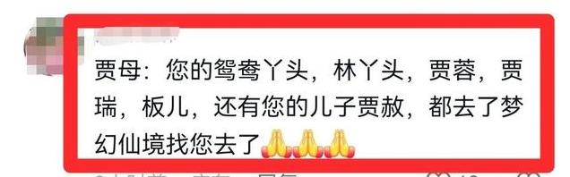 有网友写道,“贾母:您的鸳鸯丫头,林丫头,贾蓉,贾瑞,板儿,还有您的儿子贾赦,都去了梦幻仙境找您去了”