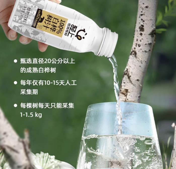 而白桦树汁水不仅珍贵,取水还有很多条件,产量也有限,它每年仅仅只有10-15天人工采集期,而且要选择直径超过20公分以上的成熟白桦树,每棵树每天也只能采集1-1.5kg原汁,所以滴滴珍贵,并且白桦树汁是100%NFC原汁,0卡,0脂肪,原液新鲜风味,没有添加,只通过瞬时杀菌后直接灌装,每一滴都是树枝精华,纯净本真,不加一滴水,高端大气上档次,也好处多多。