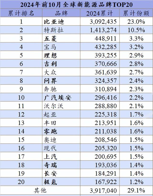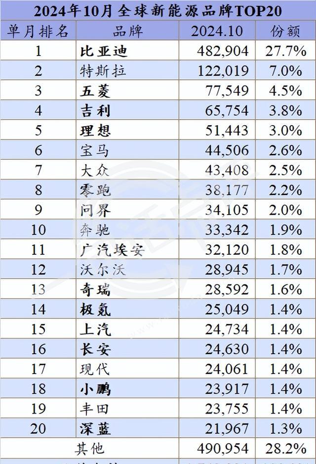 再从品牌榜单来看,比亚迪又一次刷新了人们的认知,10月继续攀升至48.3万辆,环比增加8.4万辆。这一数字只比特斯拉的最高季度销量纪录——去年四季度的48.5万辆少0.2万辆。