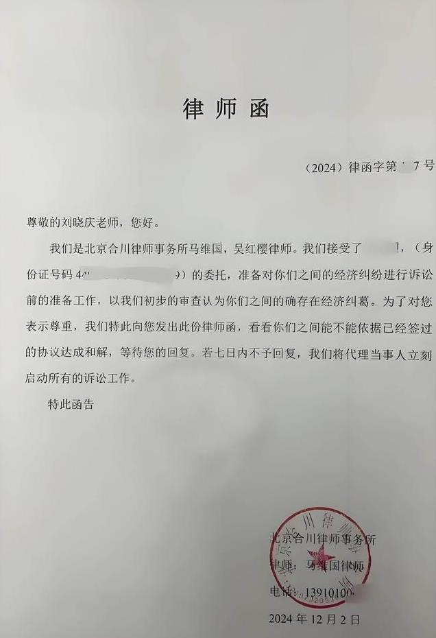 早在2024年12月2日,北京合川律师事务所的马维国、吴红樱律师,受古柯委托,已向刘晓庆发律师函,希望双方能够达成和解。若7日内刘晓庆不予回复,两位律师将代理当事人启动所有的诉讼工作。