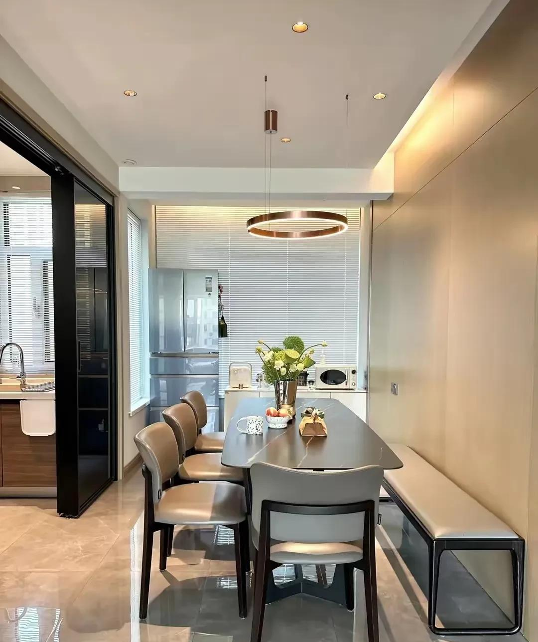 这位美女在餐厅的装修上选择了一张黑色岩板餐桌,黑色岩板给人一种非常大气的感觉,非常符合现代简约风格。为了增加一些亮点和装饰感,她还在餐厅的上方悬挂了一盏精致的吊灯,吊灯的光线柔和,可以为整个餐厅营造出温馨的氛围。