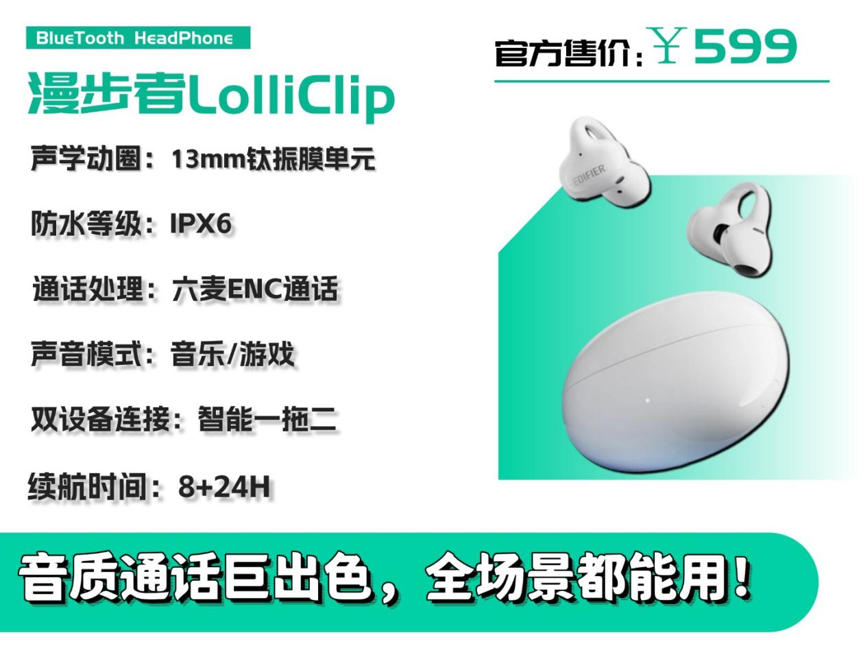 漫步者 Lolli Clip价格:599元推荐理由:通话降噪能打,空间音频加分,办公通勤适配性强