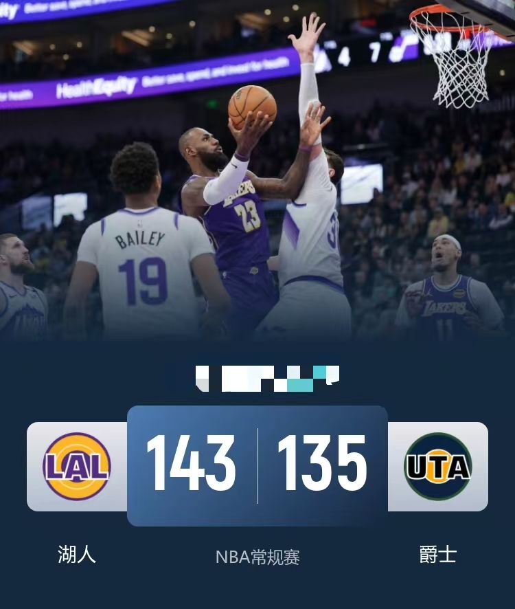 易边再战,湖人延续追分势头,但贝利突然爆发连中三分,爵士总能回应守住优势,三节结束后爵士依然领先4分,末节决战,湖人一波10-0实现反超,乔治连中三分试图回应,但斯玛特和东契奇连中三分,决胜时刻湖人连中罚球锁定胜局,爵士反扑未果,最终143-135湖人击败对手。