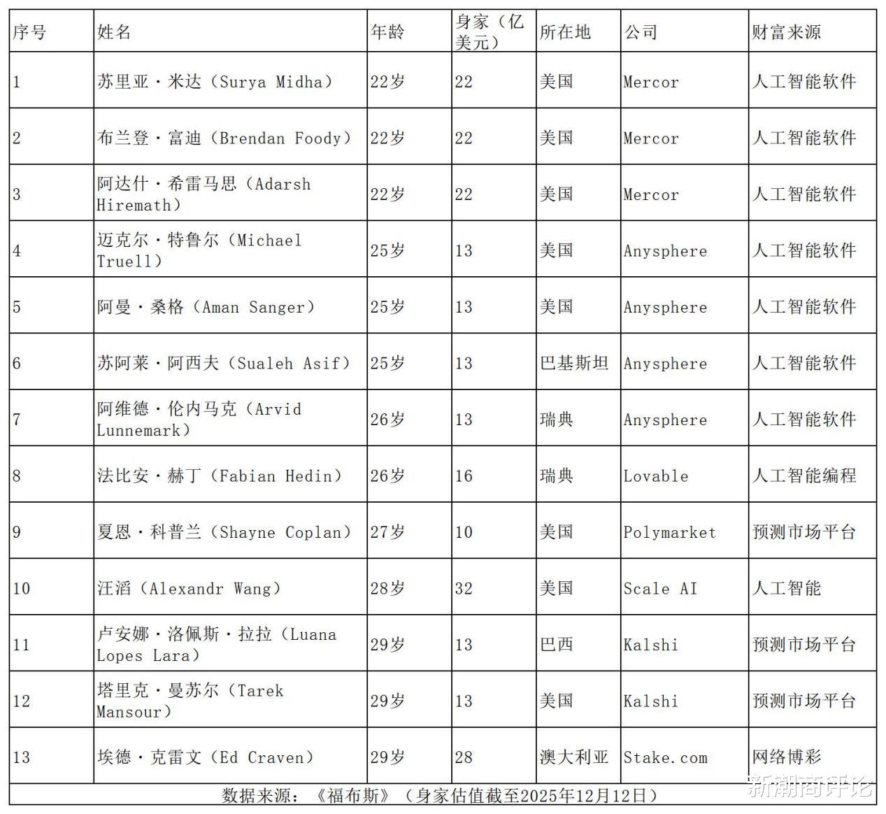 《福布斯》统计的13位三十岁以下白手起家亿万富豪中,有12位财富来源与AI相关。Scale AI创始人汪滔(Alexandr Wang)是其中最富有的,28岁身家达到32亿美元。