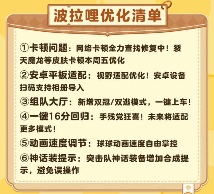 在之前发布的“策划超听劝”特别视频中,针对评论区“将一键十六分改为永久技能”“取消技能冷却时间”等热议提议,策划表示:“我们正在探索技巧系统的长期运营方案,未来这些快捷操作会适配更多玩法模式。” 此番回应让球宝们非常期待,不少球宝留言呼吁在“星际逃亡”“极限大逃杀”等玩法中加入技巧适配。
