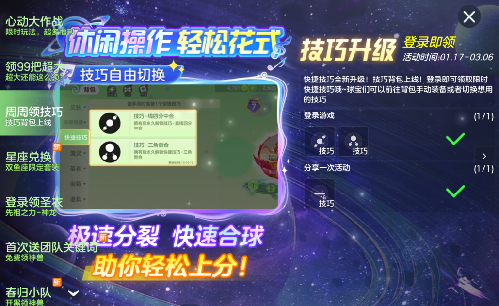 2月21日至3月6日期间,球宝们每日登录即可免费领取7天技巧道具,体验极速分裂、精准合球的畅快操作,助力赛季段位冲刺!