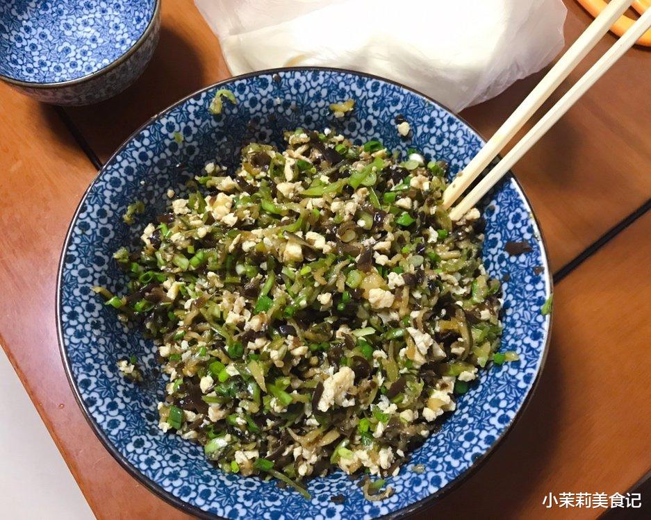 4、所有的食材都装到一起,葱油也倒进去,先拌匀,再酌情补盐,芝麻油,味道调香后开始包。素馅比较散,在包的时候要牢固些,以免散落。