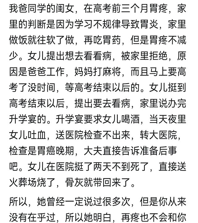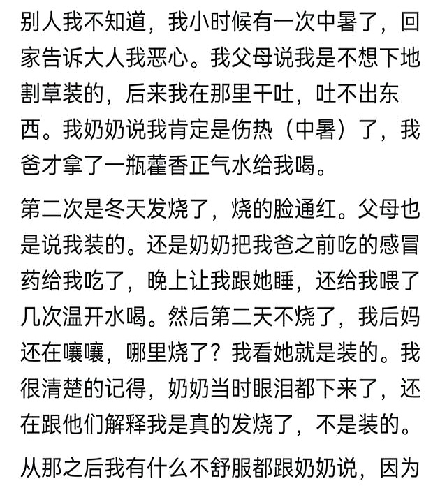 “小时候肚子疼,跟妈妈说,她总是说我装病,不想写作业。”
