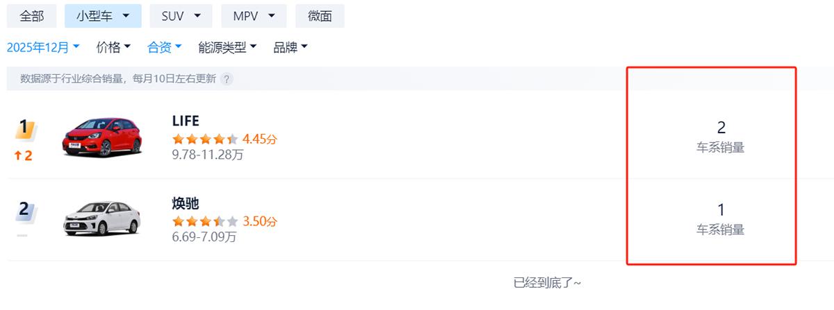 至此,国内合资品牌小型燃油车销量榜上还仅剩本田LIFE和起亚焕驰两款车型,其中LIFE销量为2,焕驰销量为1。