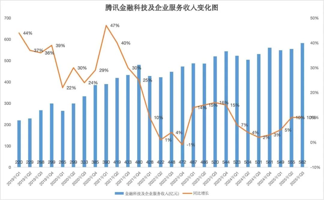 根据财报,第三季度,腾讯金融科技与企业服务收入同比增长10%至581.7亿元,这也是最近两年来最好的同比增速。