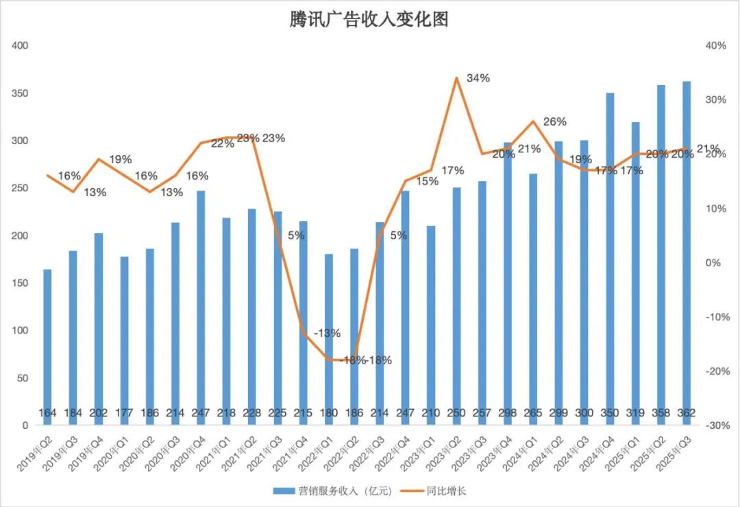 财报显示,第三季度,腾讯营销服务业务增长21% ,达到362亿元。腾讯方面称,增长乃由于广告曝光量的提升,这得益于用户参与度及广告加载率的提高,以及AI 驱动的广告定向所带动的eCPM 增长。本季所有主要行业的广告主投放均有所增长。