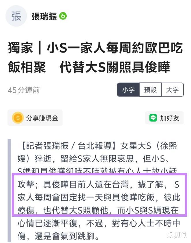 很快台北的一位媒体人曝小S的大瓜,看了这则爆料后,瞬间理解小S为什么每周,都要去陪同具俊晔一次,原来也是有苦衷的。