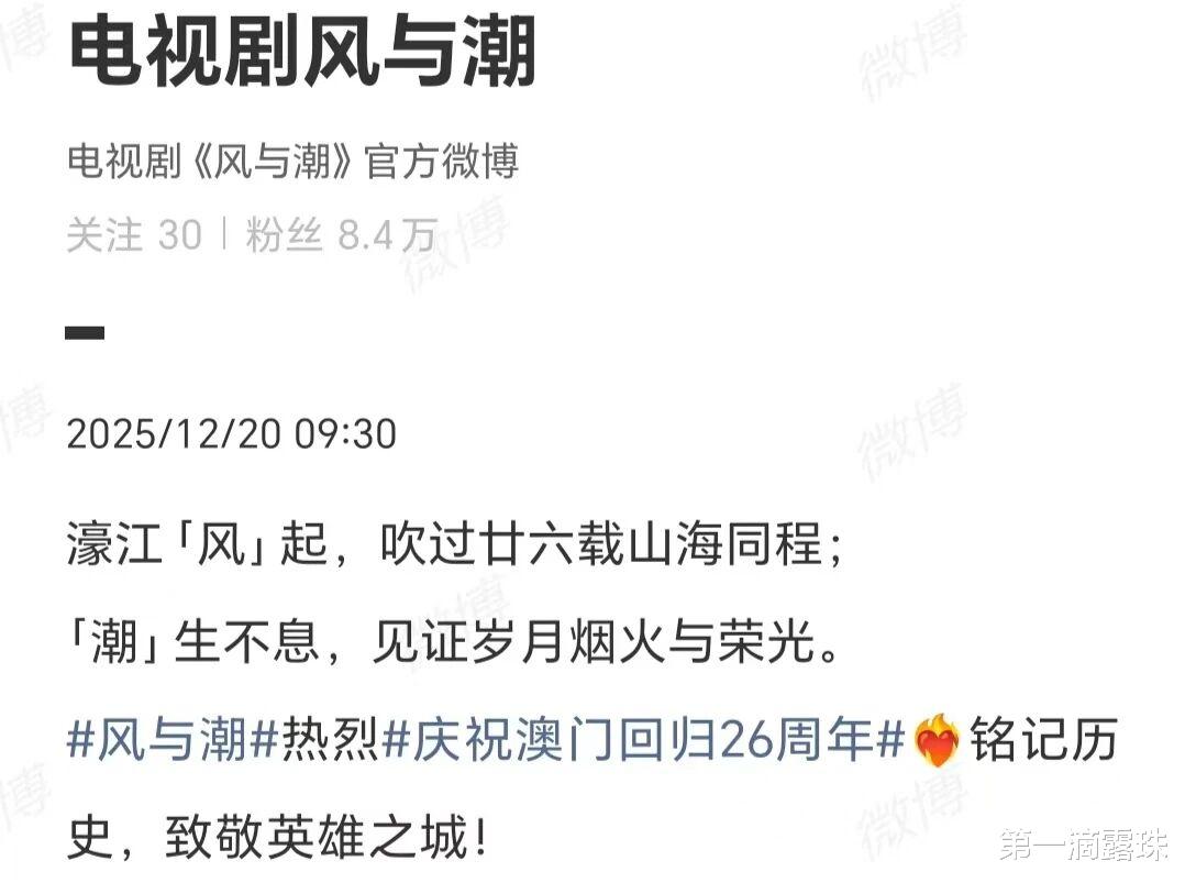 澳门回归26周年,《风与潮》剧组发文庆祝:濠江风起,吹过廿六载山海同程;潮生不息,见证岁月烟火与荣光。