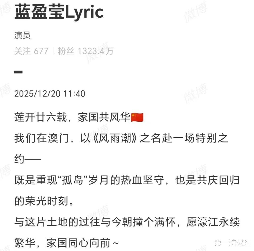 12月19日,《风与潮》澳门观影交流会在澳门成功举行。在交流会成功举行和澳门回归26周年之际,《风与潮》女主乔音婉演员蓝盈莹写道:莲开廿六载,家国共风华。