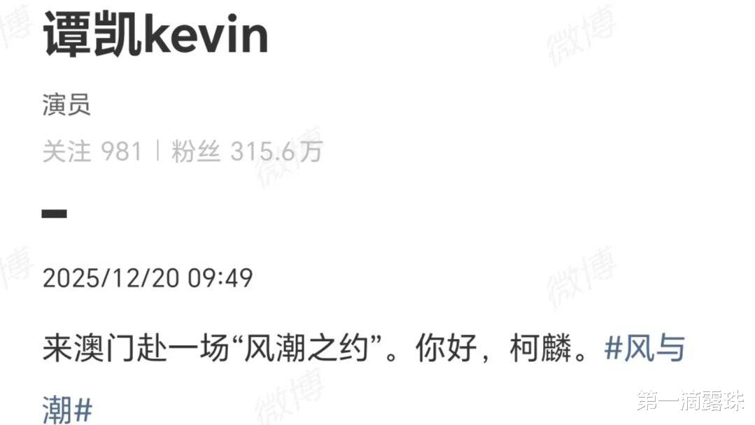 澳门回归26周年,谭凯写道:来澳门赴一场“风潮之约”。你好,柯麟。