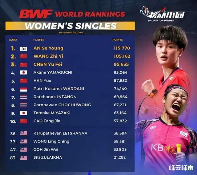 截至3月10日,安洗莹以115,770分的排名积分,守住了女单榜首位置。与第二名王祉怡(中国·105,162分)的差距高达1万分以上。安洗莹的对手陈雨菲(中国·95,635分)、山口茜(日本·93,064分)以及韩悦(中国·87,550分)也远不及安洗莹的排名积分。