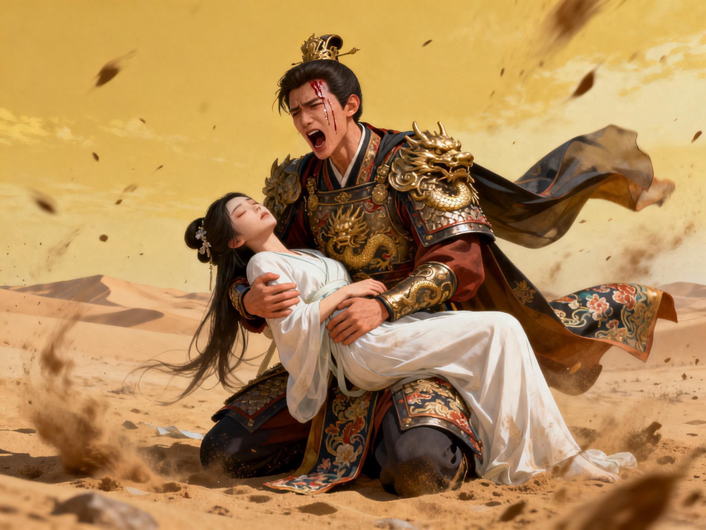他徒劳地摇晃着怀中的人,回应他的,只有一片死寂。她的身体正在他怀中一点点变冷,冷过他此生经历过的任何一个寒冬。温热的泪混着额角淌下的血,一滴滴砸在黄沙上,瞬间洇开,又转瞬被吸干。