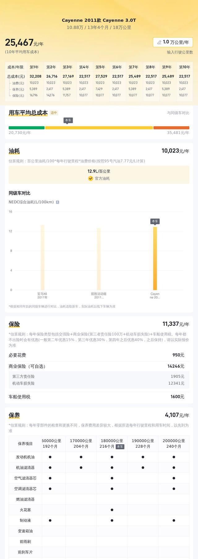 当然,购车的决策不仅仅停留在车子本身的性能和空间之上,市场行情也对二手车的购买决策影响颇深。根据目前市场行情,Cayenne 2011款的销售价格普遍在10.97万至14.17万之间,而当前具体报价为10.88万,显然低于市场价。在多数消费者眼中,Cayenne的保值率相对较高,46.72%的保值率在同级车中处于领先地位。这意味着,其在二手市场的流通性较强,为潜在买家提供了更高的投机空间。然而,长超行驶里程(18万公里)的车辆从保养费用来看,势必会引发一些消费者的担忧。