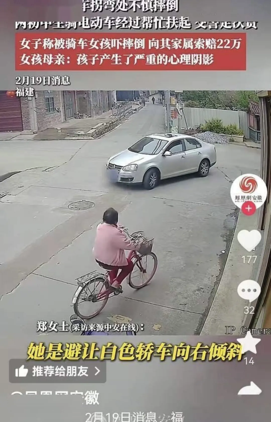 ①路上车来车往不是很正常的,老人骑车摔倒怎么能怪别人骑车经过把她吓倒的,难道她骑车经过的地方,所有车辆都必须停下来吗?就算她真的被吓倒也是她自身心理问题,关周围车辆什么事? ②看到视频她停车下来不应是两脚放下支撑地面吗?怎么会身子直接倒在地面呢?这种行为很不正常,感觉是碰瓷的节奏。 ③无接触事故到底是谁发明的,按这个逻辑,道路的设计者,建造者也有责任,因为作为事故的当事人,几乎不承认自己本人是事故的原因,周围一切才是