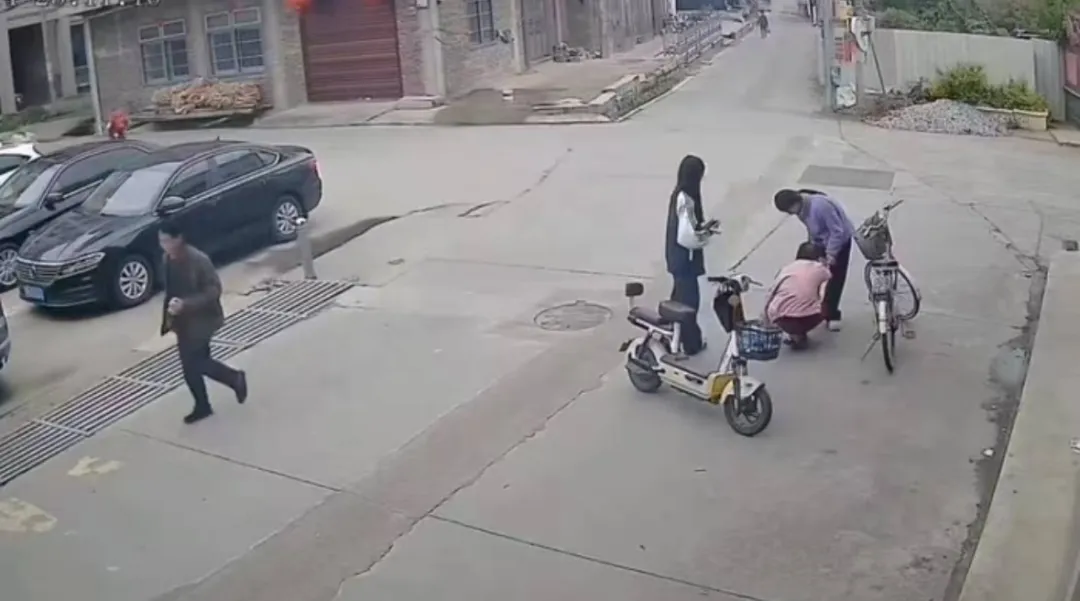 一位老人骑自行车经过路口时,在避让车辆过程中摔倒。两名骑电动车路过的初中生看到后,停下车将老人扶起。
