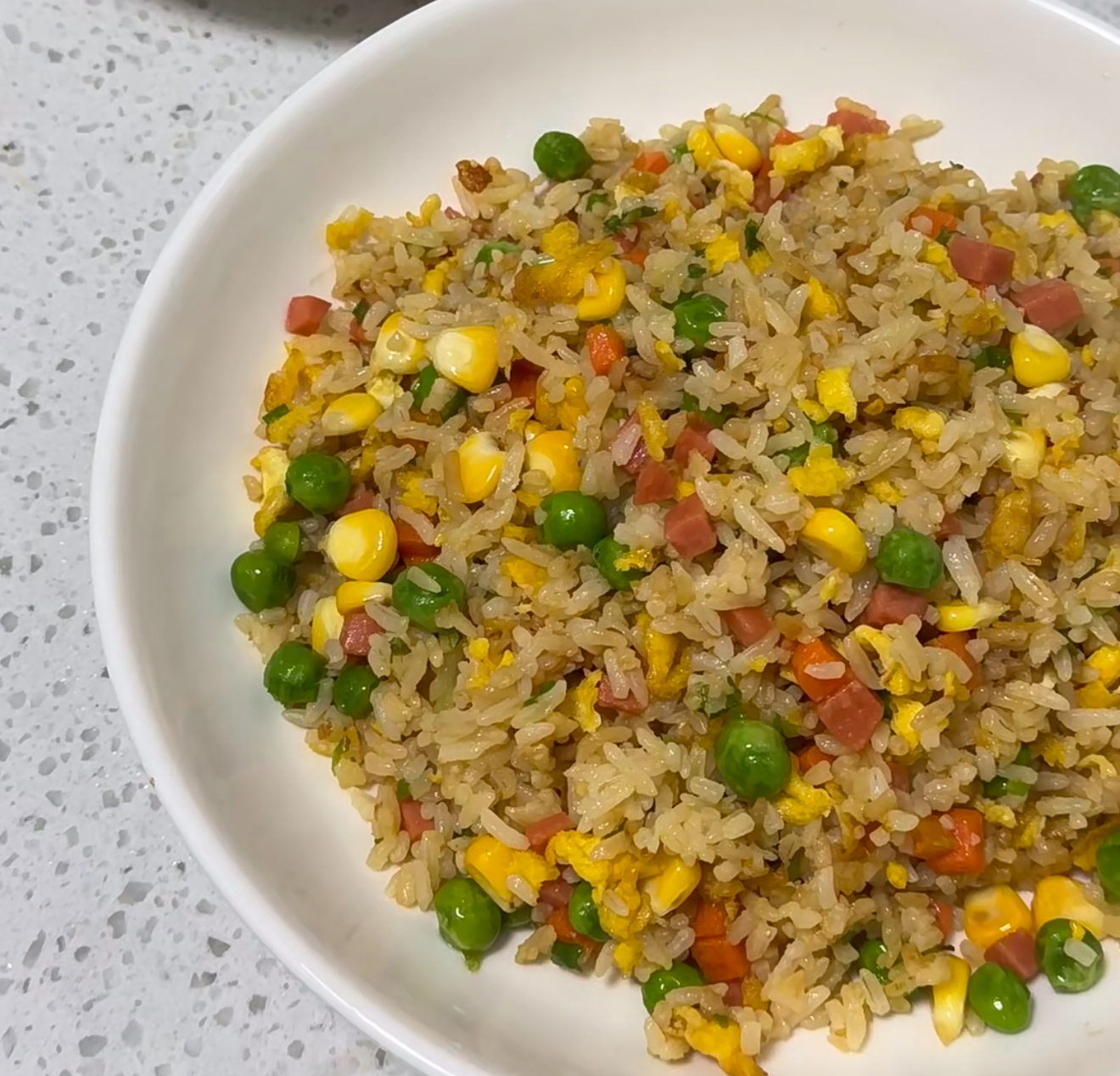 当米粒在锅中蹦跳成金黄色的海洋时,依次撒入火腿丁、青豆玉米粒和虾仁。这时要转大火快速翻炒,让各种食材在高温中碰撞出香气火花。最后淋入少许生抽,撒上葱花,像画家点染最后几笔青翠,瞬间整盘炒饭焕发出令人垂涎的光彩。
