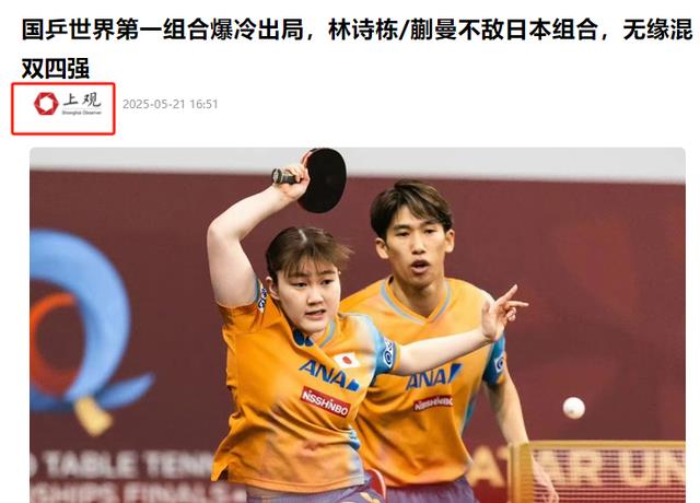信源:上观新闻 2025年5月21日关于“国乒世界第一组合爆冷出局,林诗栋/蒯曼不敌日本组合,无缘混双四强”的报道