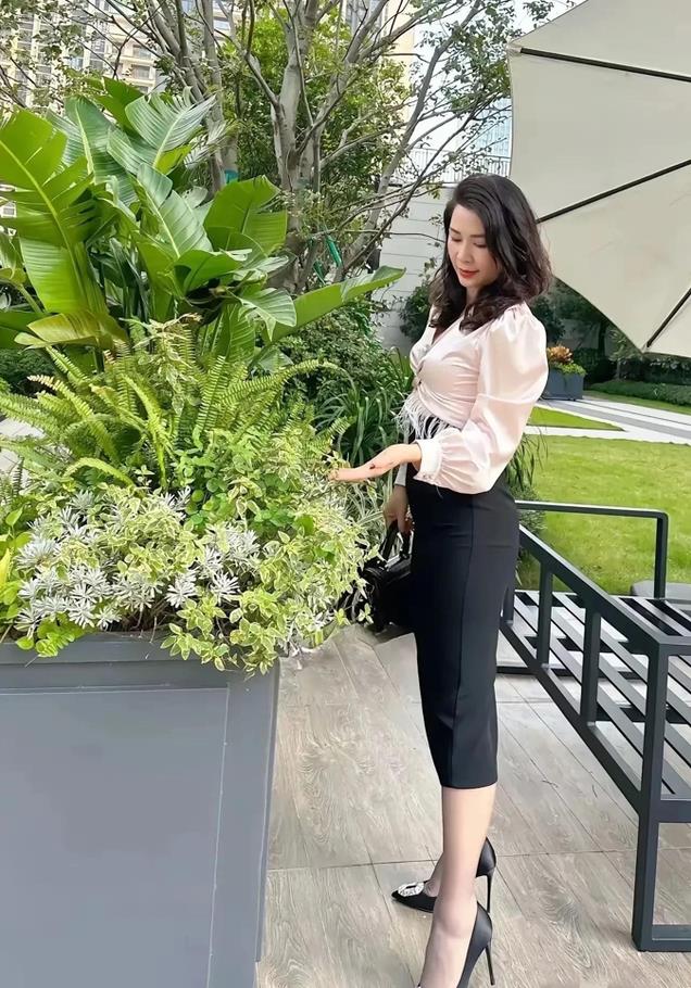 这位坐在草地上的优雅女性身穿米粉色上衣、黑裙子的搭配,与她优雅的气质和温暖的微笑形成了鲜明的对比。