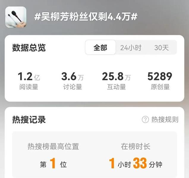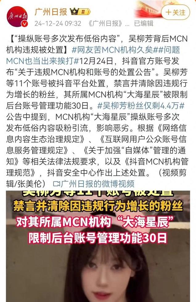 12月24日,抖音安全中心发布公告,对包括吴柳芳的“56学姐(798)”账号在内的11个账号采取了禁言、暂停营利权限、清除违规粉丝等处置措施。其所属MCN机构“大海星辰”也被限制后台账号管理功能30日。至此,吴柳芳的账号粉丝从巅峰时期的600多万锐减至4.4万,“吴柳芳粉丝仅剩4.4万”的话题也迅速登上了微博热搜榜首。