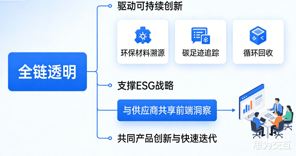 驱动可持续创新:透明供应链使得环保材料溯源、碳足迹追踪、循环回收等变得可行,有力支撑企业的ESG(环境、社会、治理)战略。同时,与供应商共享前端洞察,可以共同进行产品创新与快速迭代。