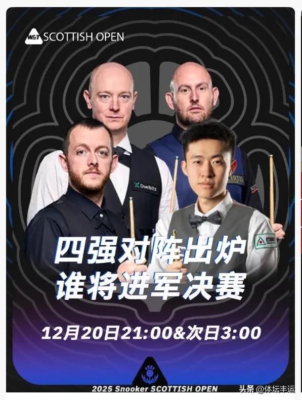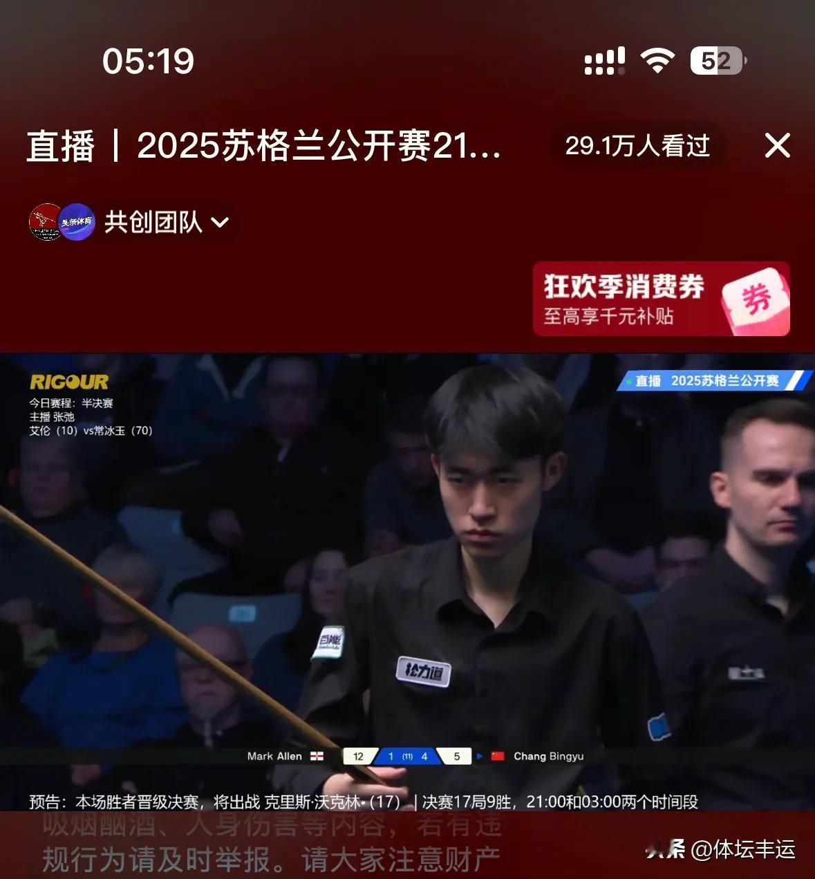 斯诺克苏格兰公开赛半决赛第二场比赛,北京时间12月21日凌晨3点,00后小将常冰玉对阵80后名将马克·艾伦,11局6胜制!上半场常冰玉3 - 1领先!常冰玉这状态简直神了,连赢3局,还有两杆破百一杆50➕。第一局单杆134分,第二局108分,艾伦第二局靠罚分才拿20分。虽第三局艾伦唯一一次上手打出33分,但常冰玉还是拿下。第四局艾伦扳回一局。