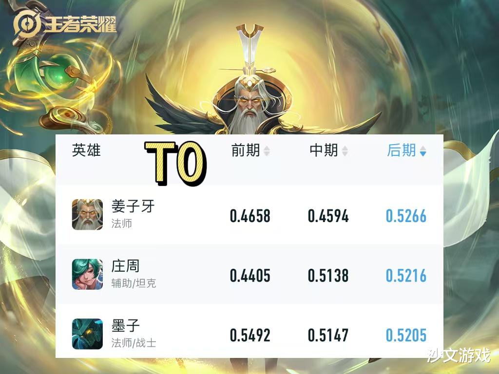 以上就是游走位后期强势T度榜,推荐使用姜子牙、庄周上分。
