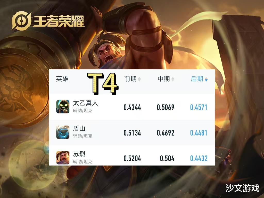排在游走位后期强势指数T4的英雄有太乙真人、盾山、苏烈,他们的后期强势指数在0.44至0.46之间。太乙现在也比较冷门,开团队友很难跟上;盾山现在能克制他的英雄太多,可以根据对面阵容后手选择;苏烈成功的垫底了辅助后期榜,现在场上很难见到苏烈上场。