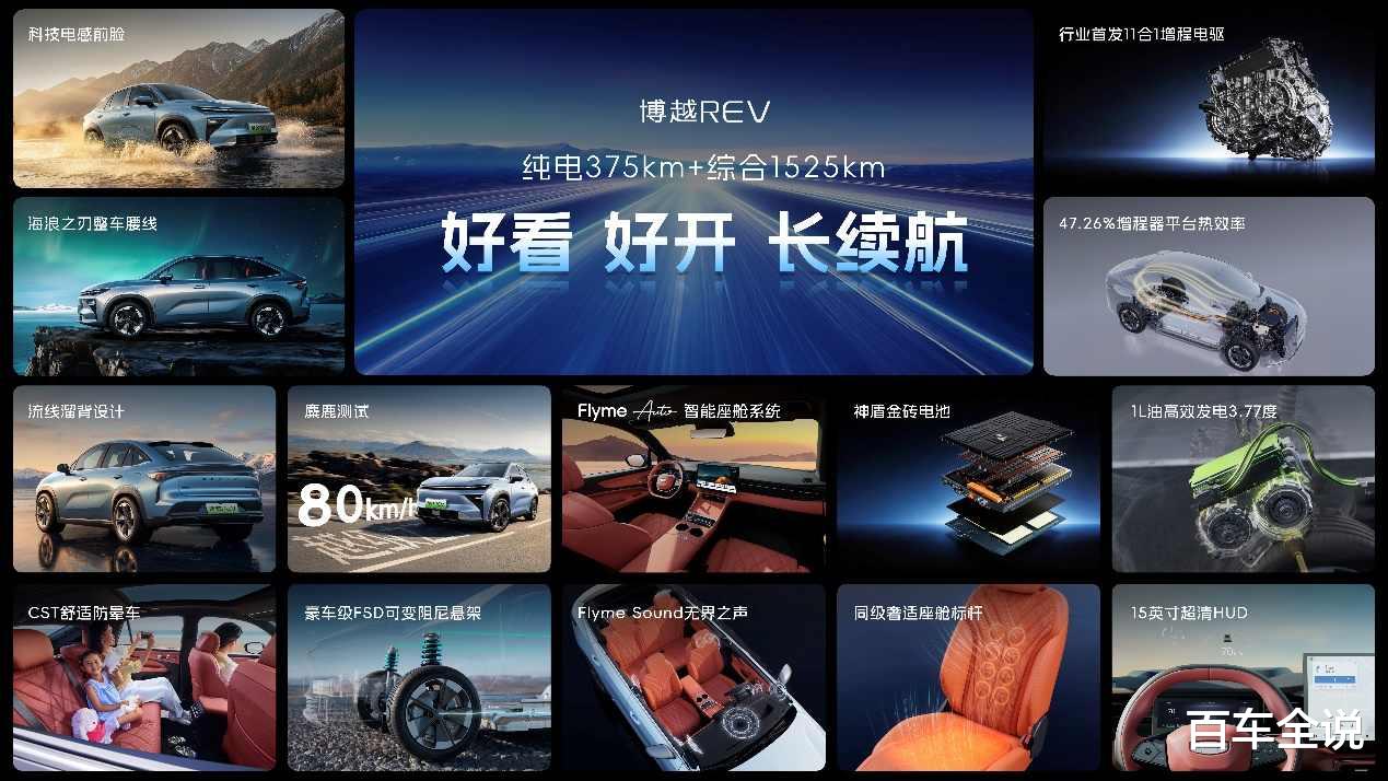 依托吉利全栈自研的超级铂金增程技术与神盾金砖电池,在增程技术的“先进性、可靠性、安全性、节能性和经济性”等5个维度实现全方位领先,博越REV纯电续航达到同级主流水平两倍,实现纯电续航最高375km、综合续航1525km,覆盖日常通勤与长途自驾等需求。行业首发11合1增程电驱系统,凭借高集成、轻量化与高能效特性,保障馈电与满电状态下动力输出稳定,动力一样强劲,同时实现领先的47.26%增程器平台热效率、1升油发3.77度电的高效油电转化率、馈电油耗低至4.95L/100km。
