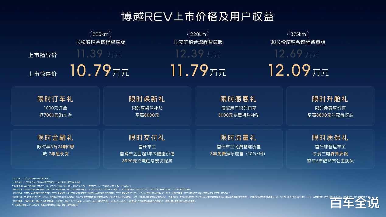 作为吉利博越十周年重磅力作,博越REV本次共推出三大版型:220km长续航铂金增程智享版、220km长续航铂金增程智尊版及375km超长续航铂金增程智尊版,上市惊喜价10.79万-12.09万元,起售价相比12.79万元的预售价格,整整下探了2万元,其中375km超长续航版本惊喜价12.09万元起,以同级领先纯电续航实力,树立A+级增程SUV价值新标杆。博越REV凭借吉利大厂品质和越级产品力,以极具诚意的售价,让20万级的高端增程体验走进更多家庭。