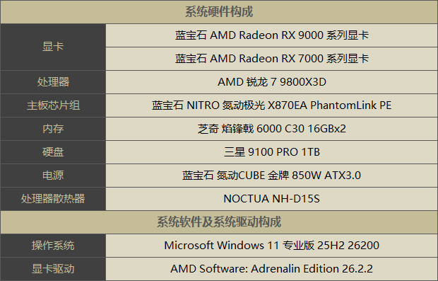 测试平台依然以经典的游戏处理器AMD锐龙7 9800X3D为核心,配备两条16GB容量6000 C30规格的芝奇焰锋戟内存条。测试时CPU未进行任何超频,仅解锁功耗墙并将PBO scalar调整至10X。驱动为最新版的AMD Software: Adrenalin Edition 26.2.2。