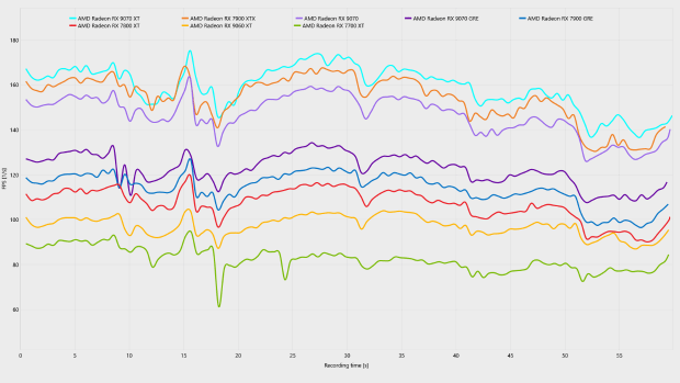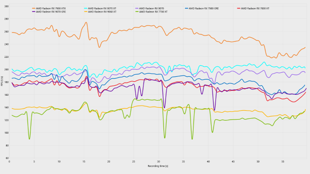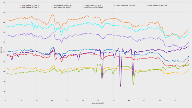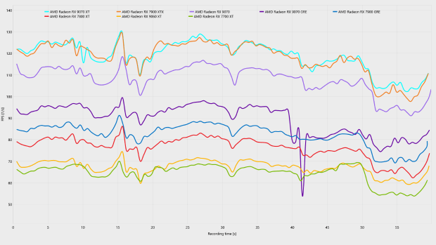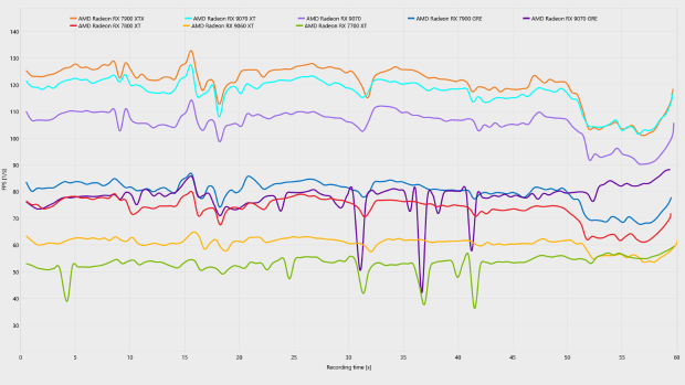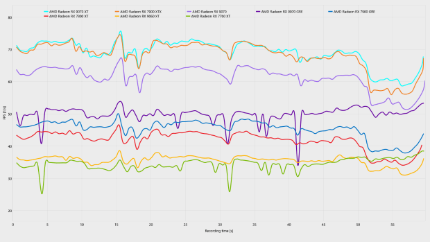 分辨率降低到2K,图形压力大幅下降,虽然从平均帧来看,几乎所有测试的显卡都能在关闭帧生成下都能实现60 FPS+的平均帧表现,但我们仔细观察可以看出,RX 9070 GRE以及RX 7700 XT这两张12GB显存显卡的low帧数远低于其他显卡,并且在曲线图中也出现了明显的波动,说到底是仍然是“爆显存”。即便是在2K分辨率下,12GB依然无法支撑起最高画质的《生化危机9:安魂曲》。相反,采用更大显存,但核心性能略弱的RX 9060 XT 16GB的帧数曲线更加稳定,反而更加适合这款吃显存的游戏。