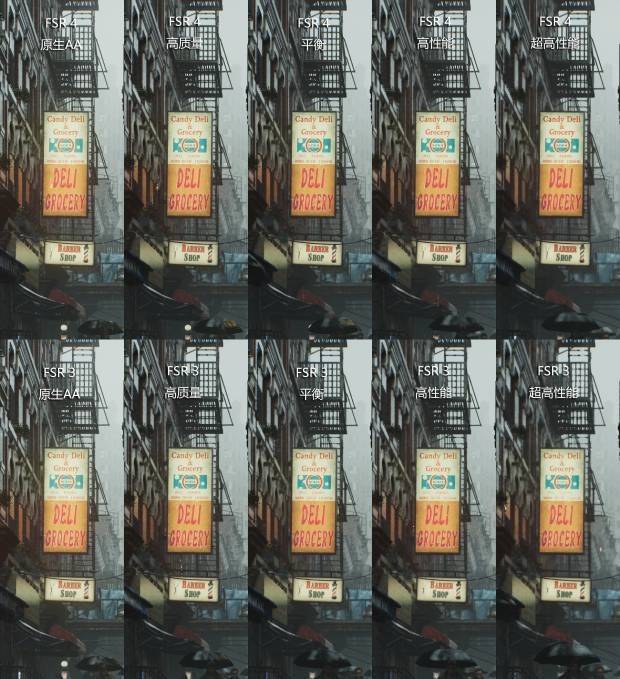 从画面素质来看,FSR 4相较于FSR 3在画质重建和稳定性上有了非常显著的进步,尤其是在低分辨率输入的情况下。例如上图中的招牌,观察中间偏上位置的“CANDY DELI & GROCERY”黄色招牌,在FSR 3的平衡、高性能甚至超高性能模式下,招牌上的文字和边缘出现了明显的模糊和像素化,甚至连招牌下方的“BARBER SHOP”字样也变得难以辨认。而在FSR 4下,即使是在高性能模式(即更低的内部渲染分辨率),文字的锐利度依然保持得很好,招牌的边框线条更加稳固,没有出现FSR 3那种由于采样不足导致的细碎感。