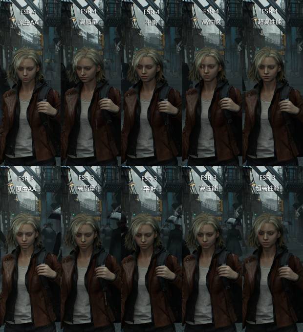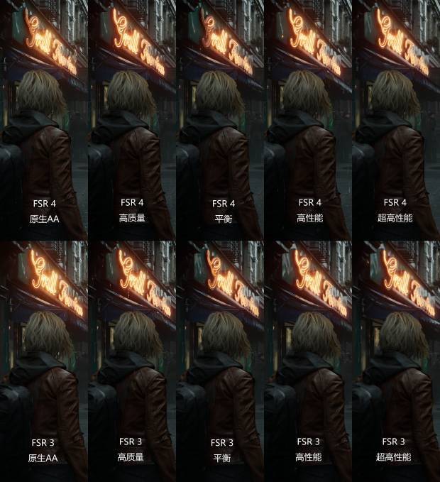 图一背影与霓虹灯招牌的对比则展示了FSR 4在处理高对比度边缘和伪影方面的进步。观察背景中的霓虹灯招牌“Grill...”,FSR 3在平衡及以下档位时,字体边缘会出现较明显的锯齿感,而FSR 4生成的字体边缘更加平滑、稳定。同时,角色皮夹克的纹理在FSR 4下也得到了更好的保留,即使是在“高性能”模式下,皮衣的褶皱和反光也比FSR 3更接近原生AA的效果。
