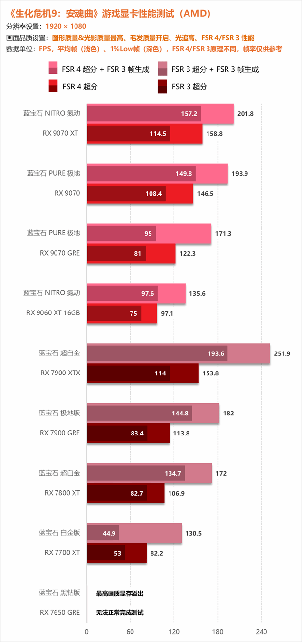 分辨率降低至1080P,所有显卡都可以轻松玩,RX 9070 XT以及RX 9070在不开启帧生成的情况下就可以实现144 FPS+的电竞级帧数。此前发生“爆显存”问题的RX 9070 GRE以及RX 7700 XT也并没有出现严重的卡顿问题。但是在开启帧生成后,由于帧生成需要占用更多的显存空间,RX 9070 GRE以及RX 7700 XT也又一次发生了严重卡顿。值得一提的是,虽然RX 9070 XT以及RX 7900 XTX的原始帧基本相差无几,但开启帧生成,RX 7900 XTX则大幅领先了RX 9070 XT。