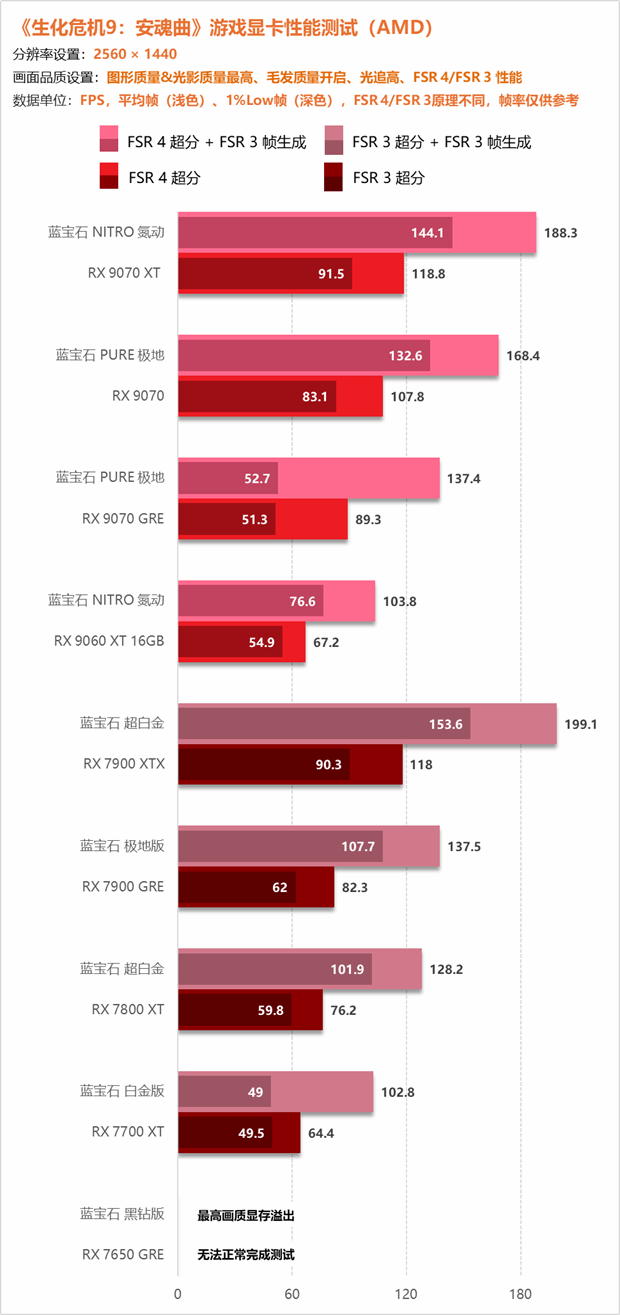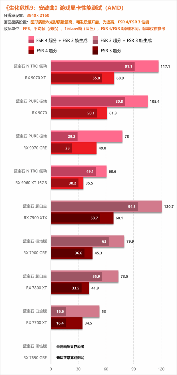 综合来看,《生化危机9:安魂曲》不仅是卡普空在叙事与氛围营造上的又一次高峰,更是对玩家的硬件提出了更高要求,尤其是显存容量。在4K与2K分辨率的最高画质下,12GB显存已逐渐显露疲态,而拥有大显存优势的显卡则在帧数平稳度上表现得更加游刃有余。而A卡在大显存上显然拥有极大的性价比优势,在RX 9070 XT以及RX 9070的价位段上,N卡竞品仅拥有12GB显存,难以以最高画质游玩,而9070两兄弟不仅拥有更强的核心性能还拥有更大的显存余量,已经成为极具竞争力的选择。