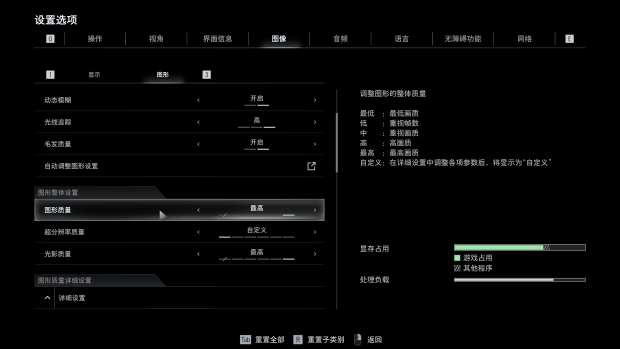 画质设置方面,我们将图形质量与光影质量调整至“最高”,并打开光线追踪至“高”档位,同时开启毛发质量功能。超分方面,由于游戏支持FSR 4,所有RX 9000系列显卡均将超分辨率技术调整至“AMD FSR 4.0.3”,档位为“高质量”,其余RX 7000系列显卡则为“AMD FSR 3.1.5”,档位同为“高质量”。需要注意的是,由于FSR 4与FSR 3原理存在差异,FSR 4更吃性能,二者帧率不可直接对比,仅供参考。