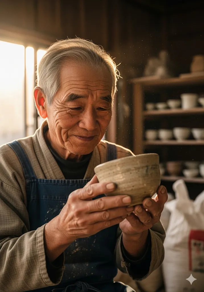 示例提示词: 一张照片级的特写肖像,主角是一位年迈的日本陶艺家,他脸上布满被阳光雕刻出的深深皱纹,带着温暖而会意的微笑。他正在仔细端详一个刚上釉的茶碗。背景是他那间充满阳光的乡村风格工作室。柔和的金色黄 昏光线从窗户射入,照亮了黏土的细腻纹理。使用85mm人像镜头拍摄,背景柔和模糊(焦外成像)。整体氛围宁静而充满大师风范。竖向构图 。