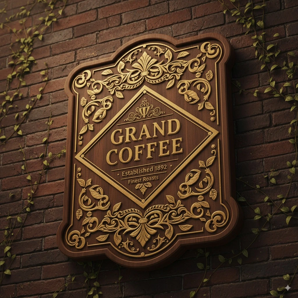 示例提示词: 一个复古风格的咖啡馆招牌,中央显示文本“Grand Coffee”。采用维多利亚时期装饰艺术风格,配色方案以深胡桃木色和金色为主。文字应清晰易读,字体为优雅的衬线体,整体布局对称且精致。非 常适合用于咖啡馆的菜单和标识 。