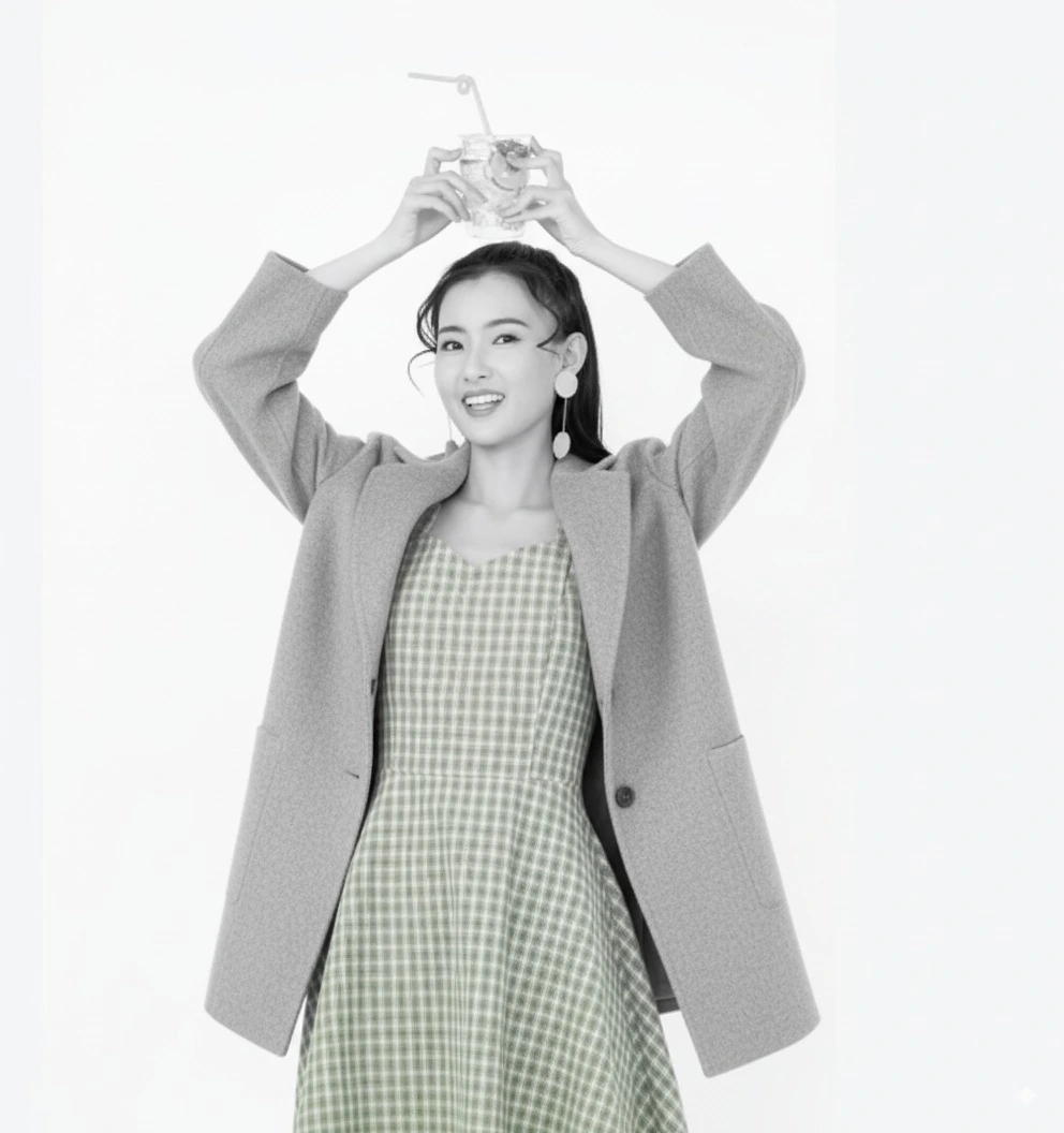 示例提示词 (服装替换): 将这件大衣穿在女模特身上,保持黑白色调 或 保持模特的姿势和表情不变,将她手中的饮料罐替换为提供红色饮料罐 。