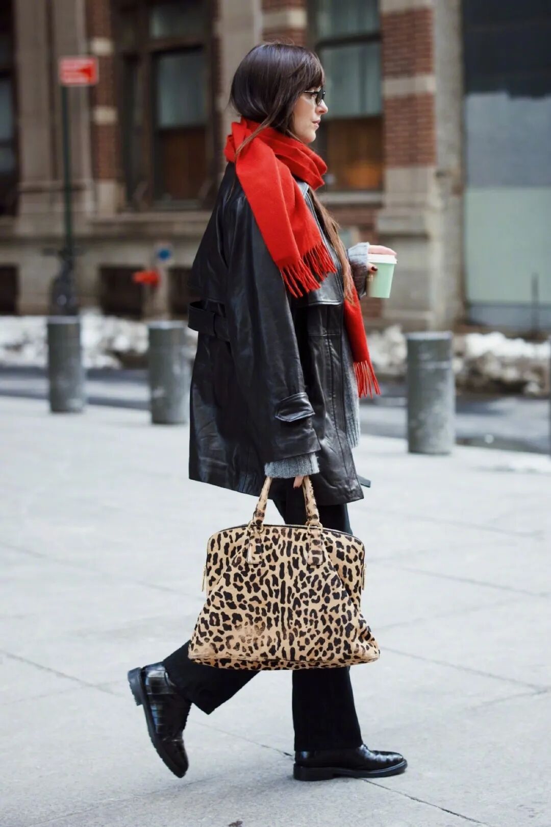 用Nour Hammour 黑色皮衣和Khaite 灰色毛衣叠穿,也是时髦得毫不费力。豹纹手袋来自Vintage Prada ,狂野的印花瞬间打破了秋冬的沉闷,为整身注入一丝灵动的复古俏皮感。