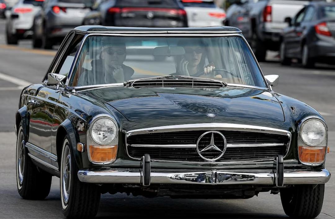 这次出行最引人注目的是她的座驾,一辆老式梅赛德斯-奔驰轿跑车,是她日常老爷车收藏的一部分。